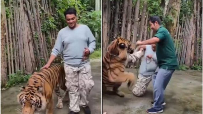 Olay anı, sosyal medya platformu X’te paylaşılan bir video ile hızla yayıldı. Videoda, turistin zincirle kontrol ettiği kaplanla birlikte yürüdüğü görülüyor. Ancak selfie çekmeye çalıştığı sırada kaplan bir anda saldırıya geçiyor. Görüntülerde ayrıca bir görevlinin turisti kurtarmaya çalıştığı anlar ve panik dolu çığlıklar yer alıyor. Eğitmenlerden biri elindeki sopa ile kaplana oturması yönünde işaret vermeye çalışıyor ancak birkaç saniye içinde kaplan saldırıya geçiyor ve ortamda büyük bir panik yaşanıyor.