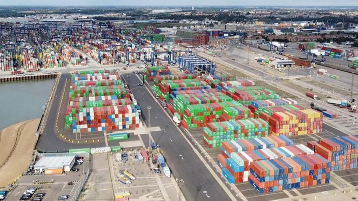 Ülkenin önemli limanlarından Felixstowe, konteynerlerle doldu. Büyük yük gemileri, sıkışıklık nedeniyle alternatif limanlara yönlendiriliyor.
