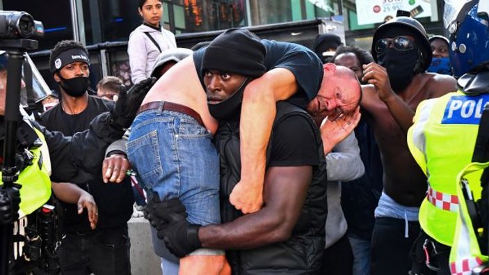 Londra'da heykelleri korumak için protesto düzenleyen aşırı sağcılar ile ırkçılık karşıtı göstericiler birbirine girerken, siyahilerin arasında kalan 2 ırkçıyı yine siyahi protestocular kurtardı.