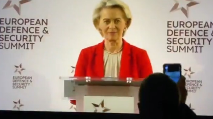 Cronin, von der Leyen'in konuşmak için sahneye çıktığı sırada, yerinden kalkarak yüksek sesle açıklamalar yaptı.
