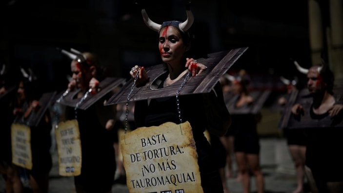 San Fermin Festivali'ne ev sahipliği yapan İspanya'nın kuzeyindeki Pamplona kentinin merkezinde toplanan bir grup boğa güreşi karşıtı dernek temsilcisi, "İşkence artık yeter. Daha fazla boğa güreşine hayır" yazılı pankartlar açtı.