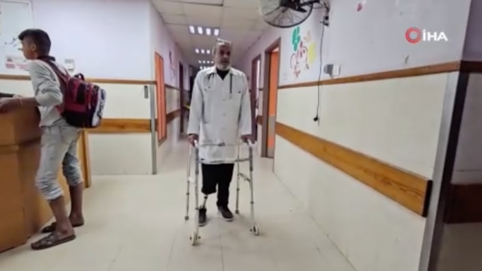 İsrail saldırıları sonucu bacağı kesilen 50 yaşındaki Filistinli doktor Khaled Al-Sa'idani, ampute şekilde hastalarına hizmet veriyor. Tedavisi için Gazze'den ayrılmaya çalıştığını söyleyen doktor, İsrail işgali nedeniyle bunu gerçekleştiremediğini belirtti.
