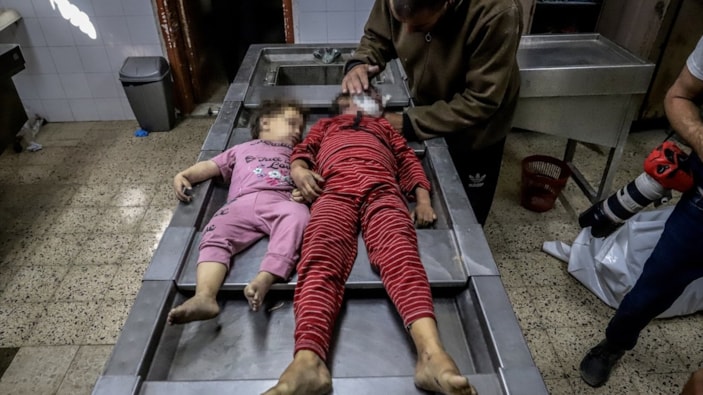 Saldırıda aralarında çocukların da olduğu yaşamını yitirenlerin naaşları, cenaze işlemleri için Gazze kentindeki Şifa Hastanesi'ne getirildi.