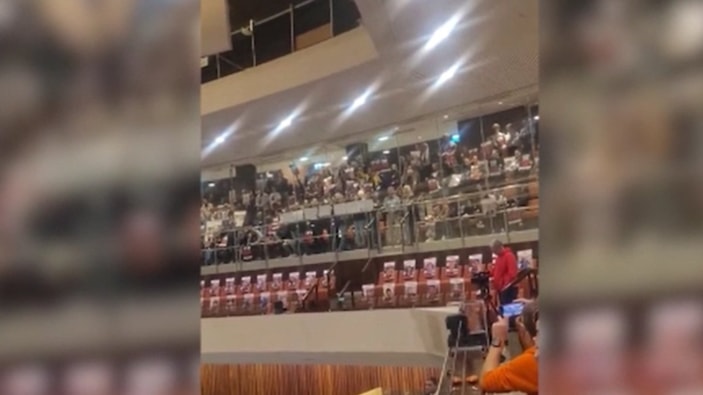 Bunun üzerine İsrailli esirlerin yakınları hep birlikte "ahşav" (şimdi) sloganlarıyla Netanyahu'nun konuşmasını bastırarak, esirlerin derhal evlerine dönmesini istedi.