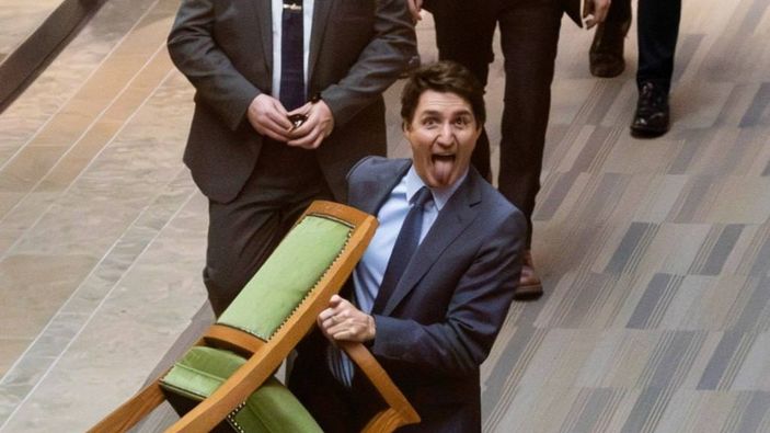 Koltuğu Parlamento binası dışına taşırken görülen Trudeau, kendisini görüntüleyen basın mensuplarına da dilini dışarı çıkararak poz verdi.