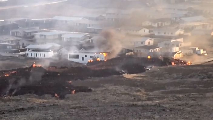 İzlanda'nın Reykjanes Yarımadası'nda bulunan Grindavik kasabası yakınlarında yanardağ patlaması meydana geldi. Dağdan akan lavlar şehre ulaşırken binalar alevlere teslim oldu.