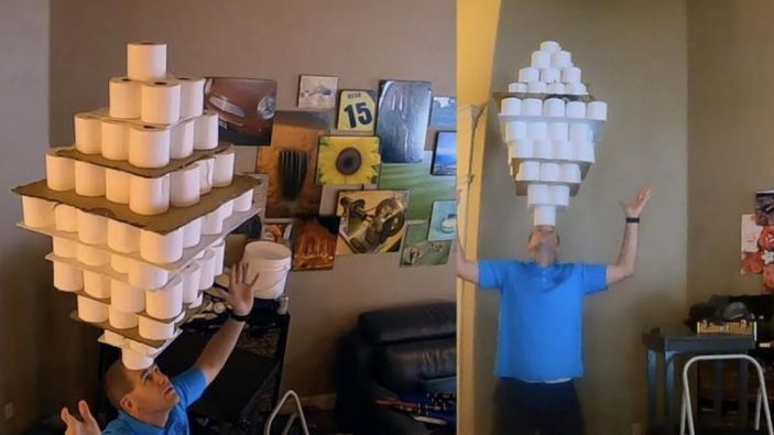 ABD'nin Idaho eyaletinde yaşayan David Rush, alnına tek bir tuvalet kağıdı rulosu koyup, üzerine kartonlar yardımıyla diğer ruloları dizerek devirmeden taşıdığı videoyu YouTube hesabından yayımladı.