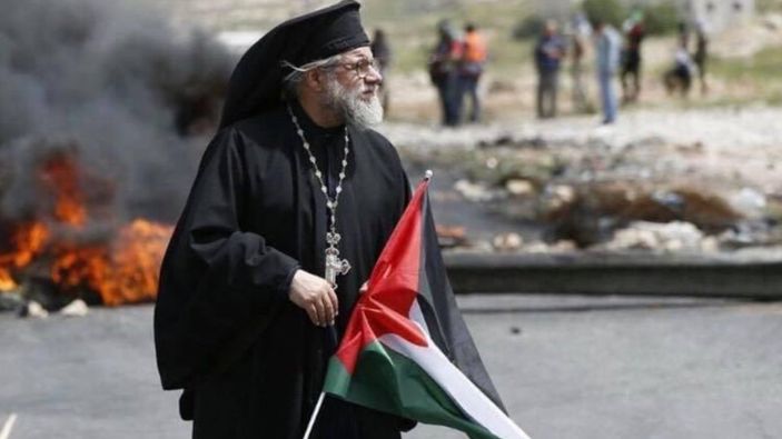Melkite Rum Katolik Kilisesi Başpiskoposu Abdullah Yulio'nun, İsrail güçlerini taşlayan Filistinlilerin yanında, elinde Filistin bayrağıyla taş ararken verdiği poz, sosyal medyada yankı getirdi.