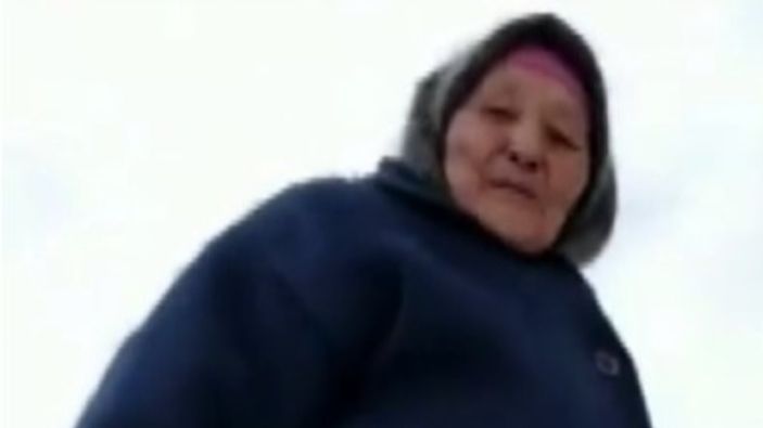 Ülkenin en soğuk bölgelerinden Narın’da yaşlı bir kadın, torunu eşliğinde bir buz tepesine çıkarak kayak yaptı.