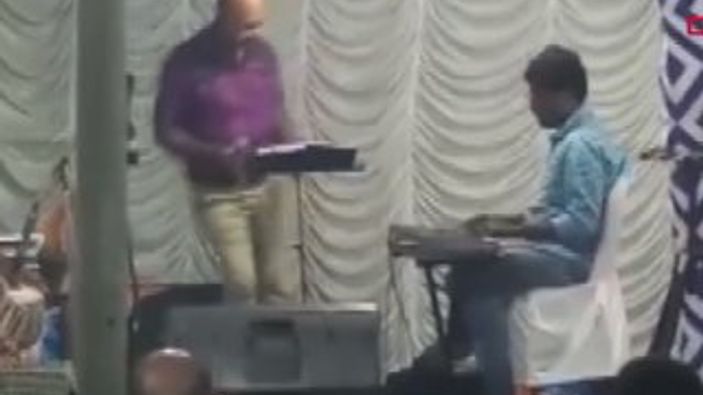 Hindistan’ın Kerala eyaletinde yer alan Neendakara şehrinde, kızının düğününden bir gün önce yapılan düğün provaları sırasında canlı müzik çalan grup ile sahneye çıkıp şarkı söyleyen 55 yaşındaki adam, aniden yere düştü.