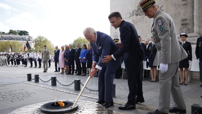 İki ülke marşlarının okunduğu törenin ardından Kral Charles, Fransa Cumhurbaşkanı Emmanuel Macron ile Meçhul Asker Anıtı'na çelenk bıraktı.