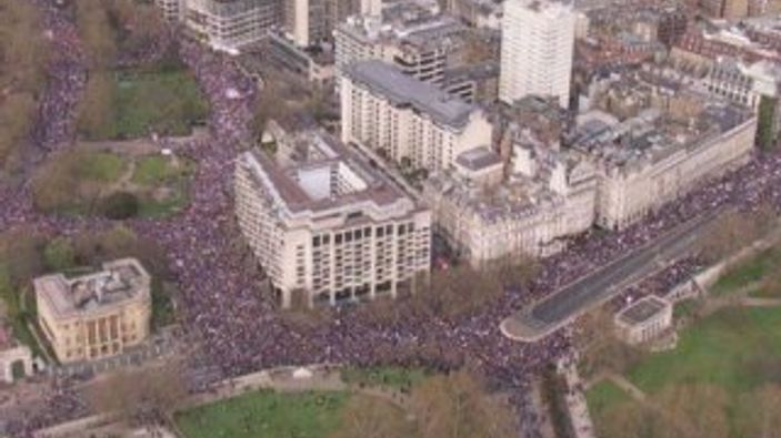 Brexit karşıtlarının tarihi yürüyüşü, helikopter kamerasından görüntülendi. Hızlandırılmış çekimde, Londra sokaklarında devasa bir kalabalık var.