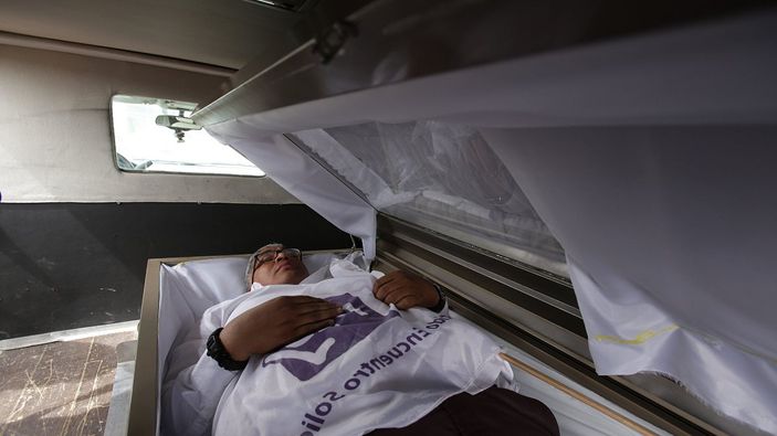 Meclisin alt kanadı için milletvekili adayı olan Carlos Mayorga, koronadan hayatını kaybedenlere dikkat çekmek için seçim kampanyasını tabuttan çıkarak başlattı.
