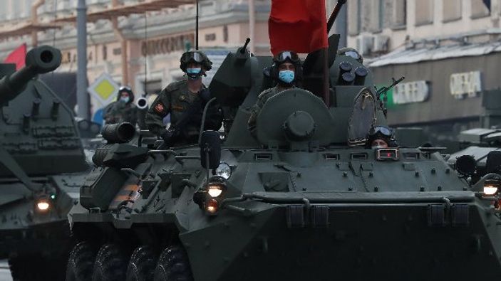 Rus askerlerinin salgın tedbirleri kapsamınd medikal eldiven ve maske taktığı görüldü. Askeri araçlar, Tverskoy Caddesi'nden tarihi Kızıl Meydan'a ulaştı.