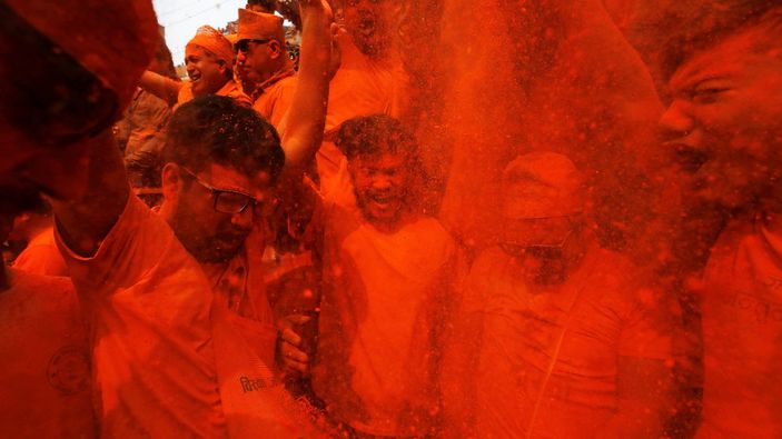 Geleneksel kutlamalar sırasında birbirilerine toz fırlatan katılımcılar, ortaya turuncu renkte manzaralar çıkardı.