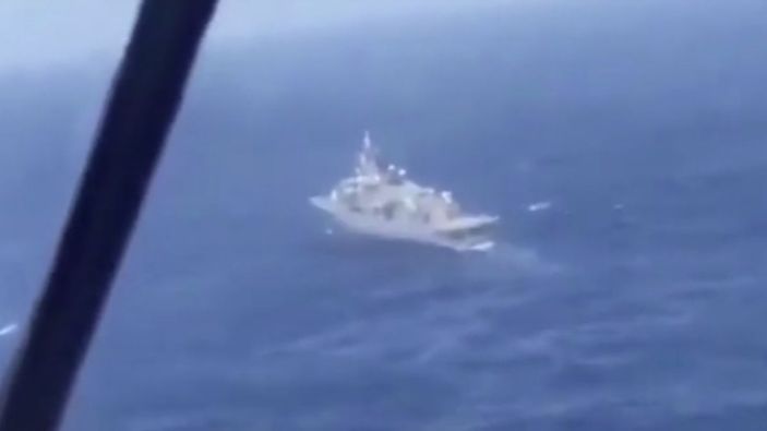 Bölgeden ayrılmak zorunda kalan Yunan fırkateyni, helikopterden görüntülendi.
