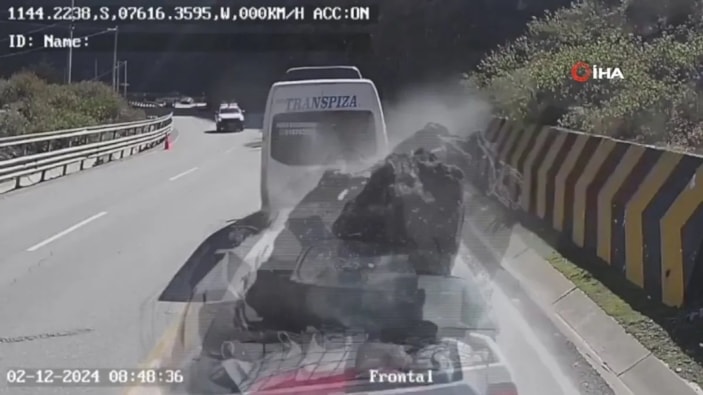 Peru’nun başkenti Lima’daki otoyolda yaşanan kazada büyük bir kaya parçası dağdan koparak park halindeki bir kamyonetin üzerine düştü.