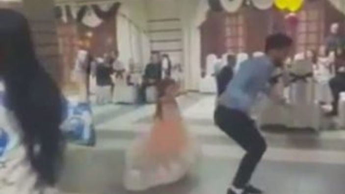 Rusya'da bir düğünde piste çıkıp ters takla atan adam, yine pistte bulunan küçük bir kızın üstüne düşünce felaketin eşiğinden dönüldü.