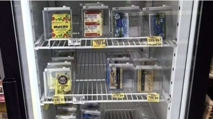 Ukrayna ile çatışmalarını sürdüren Rusya'da enflasyon krizi giderek artıyor. Fiyat artışları halkı olumsuz etkilerken süpermarketler tereyağı gibi ürünlerle ilgili karar aldı. Hırsızlık vakalarının artması sonucu ürünler depolarda saklanıyor.