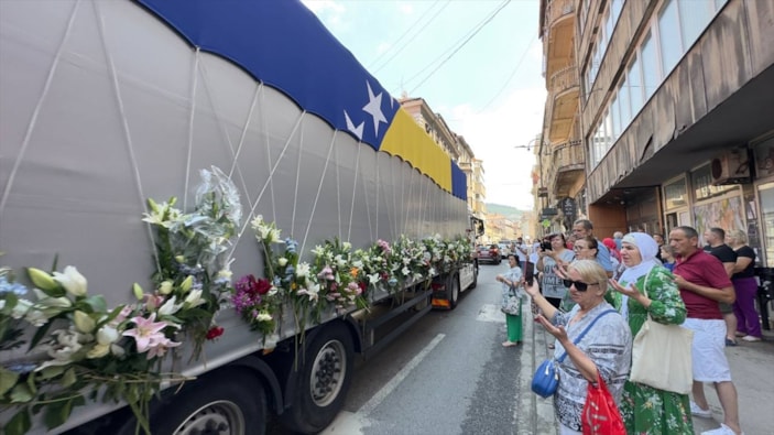 Visoko Şehir Mezarlığından sabah saatlerinde hareket eden, soykırımında hayatını kaybeden ve kimlikleri tespit edilen 30 kurbanın tabutlarını taşıyan konvoy, başkent Saraybosna'daki Cumhurbaşkanlığı binası önüne geldi.