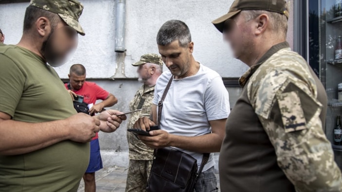 Ukrayna’nın Harkiv kentinde, Harkiv Askerlik şubesi (TCC) görevlileri, askere çağrılacak erkekleri tespit etmek için sokaklarda devriye gezip kimlik kontrolü yapıyor.
