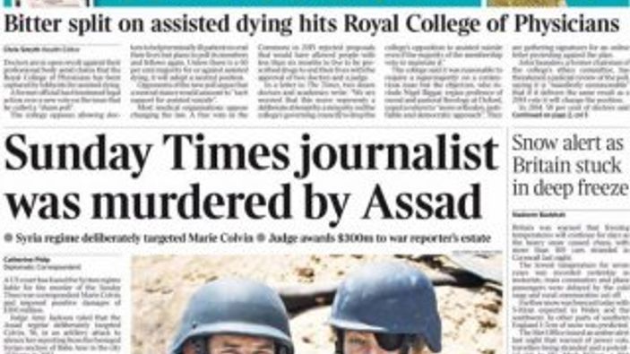 İngiliz Times gazetesinin manşetinde, gazetenin Suriye'de faaliyet gösteren muhabiri Marie Colvin'in, Esad rejimi tarafından hedef alınıp öldürüldüğü yazıldı.