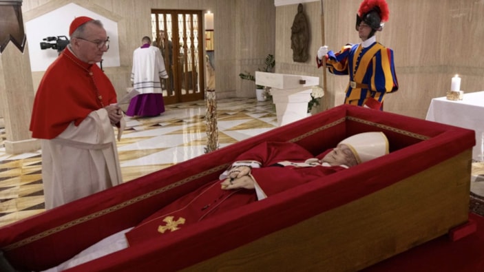 Papa Francis'in naaşı, bugün Vatikan'da düzenlenen ve Papa'nın ölümünün onaylandığı tören için açık tabutun içine konuldu.