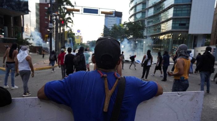 Başkent Karakas'ta başkanlık sarayı Miraflores yakınlarında toplanan kalabalığa göz yaşartıcı gazla müdahale eden polis, kalkanlar ve coplarla bariyer kurdu.