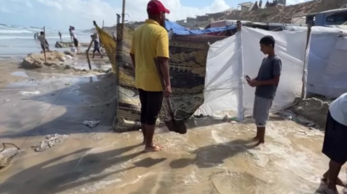 Gazze'de İsrail ordusunun sahile sıkıştırdığı yerinden edilmiş Filistinliler, çadırlarını basan deniz suyu nedeniyle bir kez daha mağdur oldu.