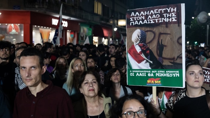 Eylemciler İsrail-Filistin çatışmasında ABD, NATO ve Avrupa Birliği'nin (AB) tutumunu da eleştirerek, Yunanistan'ın bu çatışmadan uzak kalmasını talep etti.