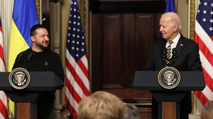 Bir yıl içinde üçüncü kez Washington'a giden Zelensky, yardım konusunda kelimelerden çok eylemlerin olması gerektiğini söyledi. Biden, yardım paketinin Cumhuriyetçilerin onayını alması için uzlaşmaya hazır olduğunu belirtti.