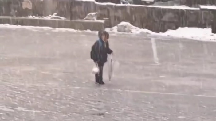 Soğuk havaya ve kar yağışına aldırış etmeden İstiklal Marşı'nı coşkuyla söyleyen çocuğun o anları, izleyenleri duygulandırdı.