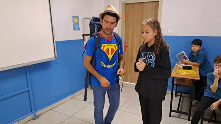 Sakarya'da İngilizce öğretmenliği yapan Emre Karakuş, "Teacherman" yazılı tişörtle girdiği sınıfta farklı yöntemlerle ders anlatıyor, öğrencilerin eğlenerek öğrenmesini sağlıyor.