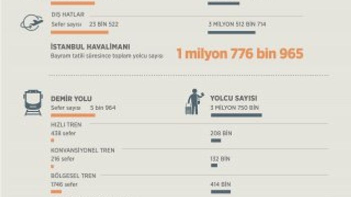 Turhan, "TCDD Taşımacılık AŞ tarafından yüksek hızlı trenlerle 438, konvansiyonel trenlerle 216, bölgesel trenlerle bin 746, Marmaray ve Başkentray ile 3 bin 564 sefer gerçekleştirildi. Ana hat trenleriyle 132 bin, bölgesel trenlerle 414 bin, YHT'lerle 208 bin, Marmaray ile 2 milyon 800 bin, Başkentray ile 205 bin yolcunun taşındı." dedi.