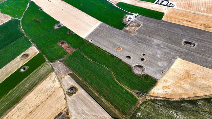 İki obruk arasının 5 metreye kadar düştüğü, çap ve derinlikleri farklı 100'den fazla çöküntünün olduğu yerde havadan çekilen fotoğraf karesine 24 obruk giriyor.