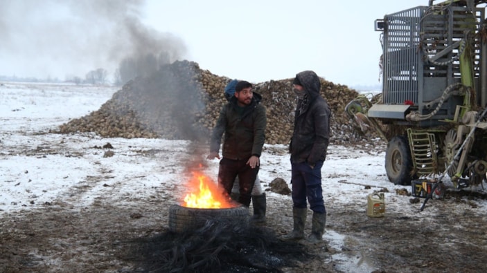 Tabii hava çok soğuk olduğu için tarlada ateş yakıp ateşin başında ısınmaya çalışıyoruz. İnşallah pancar sökümünü bitirip bu sezonu kapatacağız.