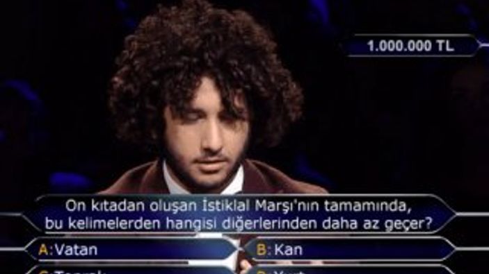 "On kıtadan oluşan İstiklal Marşı'nın tamamında, bu kelimelerden hangisi diğerlerinden daha az geçer?" sorusuna genç yarışmacı "Vatan, kan, toprak, yurt" seçenekleri arasından "toprak" cevabını verdi.