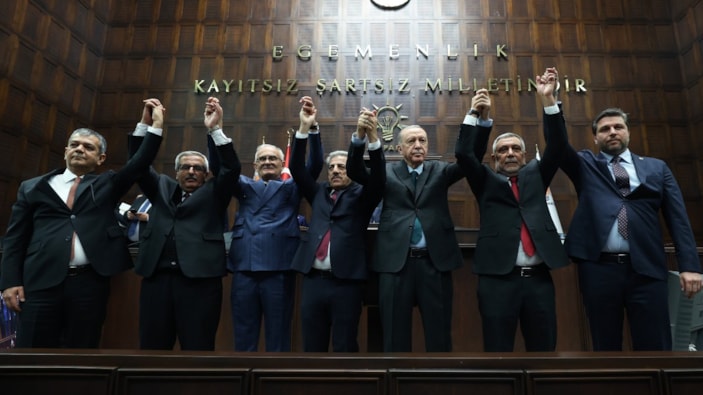 Daha sonra ise Cumhurbaşkanı Erdoğan, partisinin TBMM grup toplantısında yaptığı konuşmanın ardından, AK Parti'ye katılan 10 belediye başkanına rozet taktı.