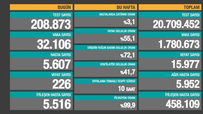 Türkiye'de koronavirüs salgınında bugün 226 vatandaşımız yaşamını yitirdi.