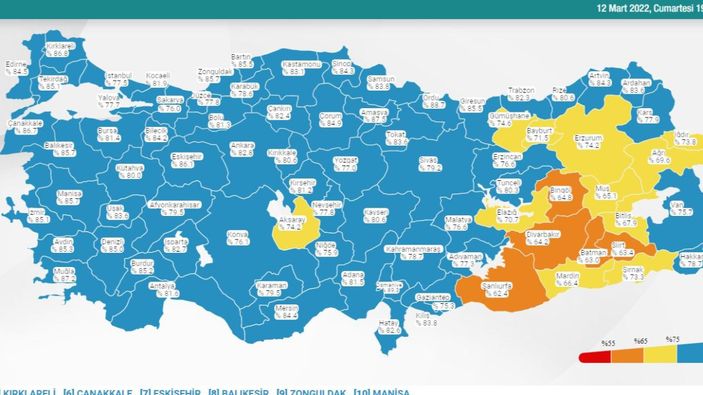 Bakanlığın tablosuna göre yüzde 62,4 ile Türkiye'de en az aşılamanın gerçekleştirildiği Şanlıurfa’yı sırasıyla Batman, Siirt, Diyarbakır, Bingöl, Muş, Mardin, Bitlis, Ağrı ve Elazığ takip etti.