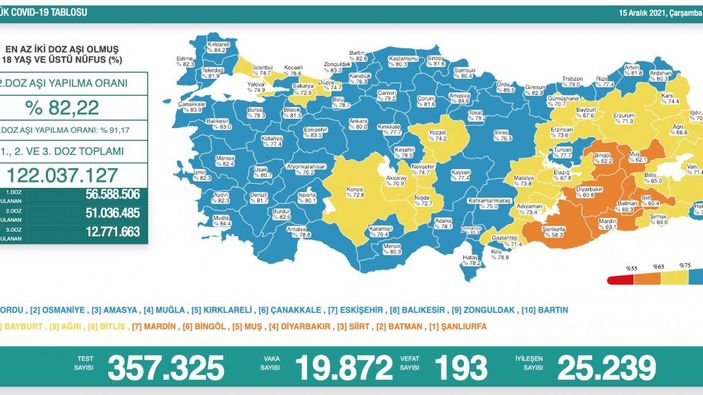 Buna göre; Türkiye'de son 24 saatte 357 bin 325 Kovid-19 testi yapıldı, 19 bin 872 kişinin testi pozitif çıkarken, 193 kişi ise hayatını kaybetti.