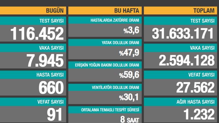 Bugünkü tabloya göre, son 24 saat içerisinde 116 bin 452 kişiye koronavirüs testi yapıldı. Böylelikle yapılan toplam test sayısı 31 milyon 633 bin 171'e ulaştı.