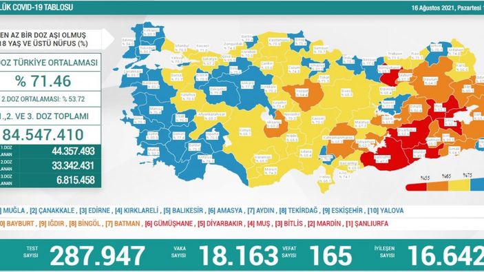 16 Ağustos Türkiye'de koronavirüs tablosu