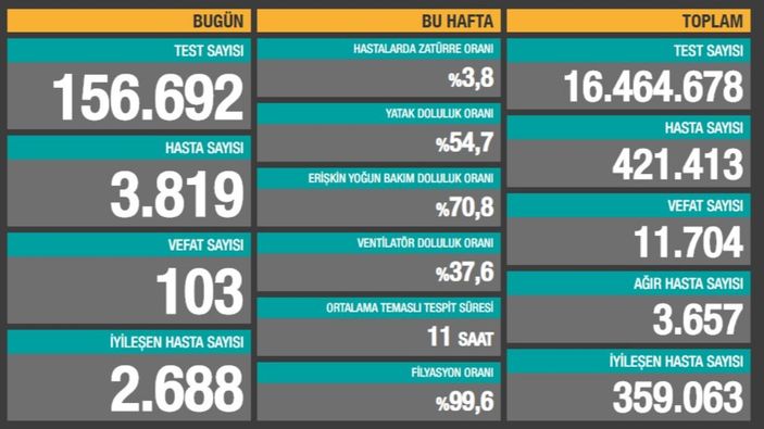 Bakan Koca'nın paylaştığı tabloya göre, bugün 156 bin 692 test yapıldı. Yapılan testler sonucu 3 bin 819 yeni koronavirüs hastası tespit edildi.
