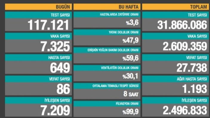 Ağır hasta sayısı 649 oldu. 7 bin 325 kişinin Kovid-19 tedavisinin sona ermesiyle iyileşen sayısı 2 milyon 609 bin 359'a yükseldi.