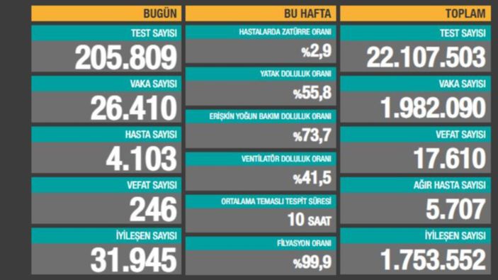 Türkiye'de bugün koronavirüs salgını nedeniyle 246 vatandaşımız hayatını kaybetti. Ayrıca son 24 saatte 26 bin 410 yeni vaka tespit edildi.