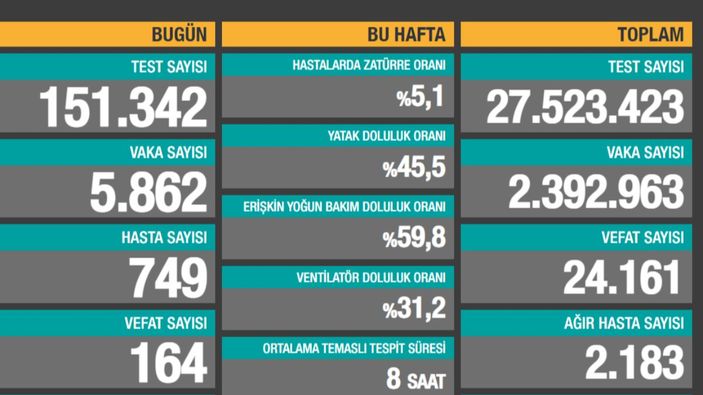 Bugünkü tabloya göre, son 24 saat içerisinde 151 bin 342 kişiye koronavirüs testi yapıldı.