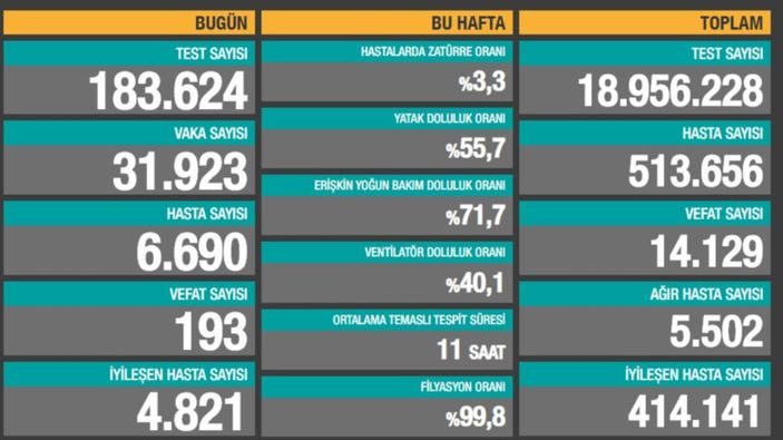 Sağlık Bakanı Fahrettin Koca, güncel tabloyu Twitter hesabından paylaşarak, "Bugün tespit edilen 6.690 yeni hastamız var. Mevsim şartları nedeniyle kapalı ortamların kullanımı arttı. Artan aktif hasta sayısını azaltmak için kalabalık, kapalı ve yeterince havalandırılmayan ortamlardan uzak durmalıyız." ifadelerini kullandı