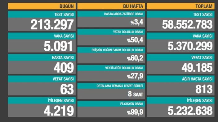 Koronavirüs salgınında son 24 saatte 5 bin 91 yeni vaka tespit edildi, 63 kişi ise hayatını kaybetti.