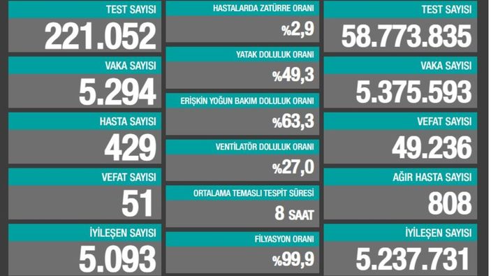 Koronavirüs salgınında son 24 saatte 5 bin 294 yeni vaka tespit edildi, 51 kişi ise hayatını kaybetti.